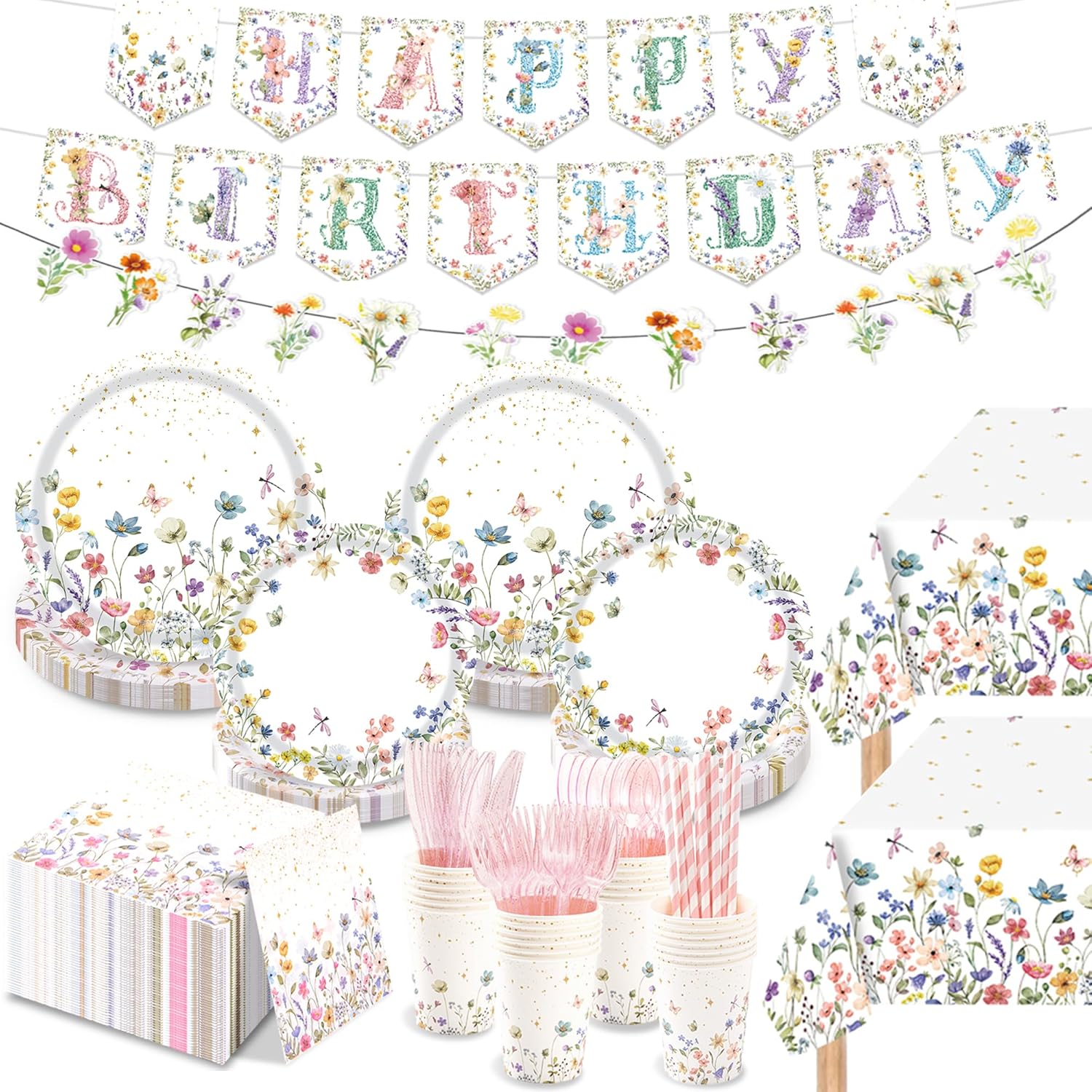 - 【Wildflower Birthday Party Decorations Kit】454 Pcs flower theme birthday decorations, includes 50 9-inch & 50 7-inch paper plates, 100 napkins, 50 cups, 50 knives, 50 forks, 50 spoons, 50 straws, 2 tablecloths (108×54inch/274×137cm), 1 happy birthday banner, 1 floral banner.