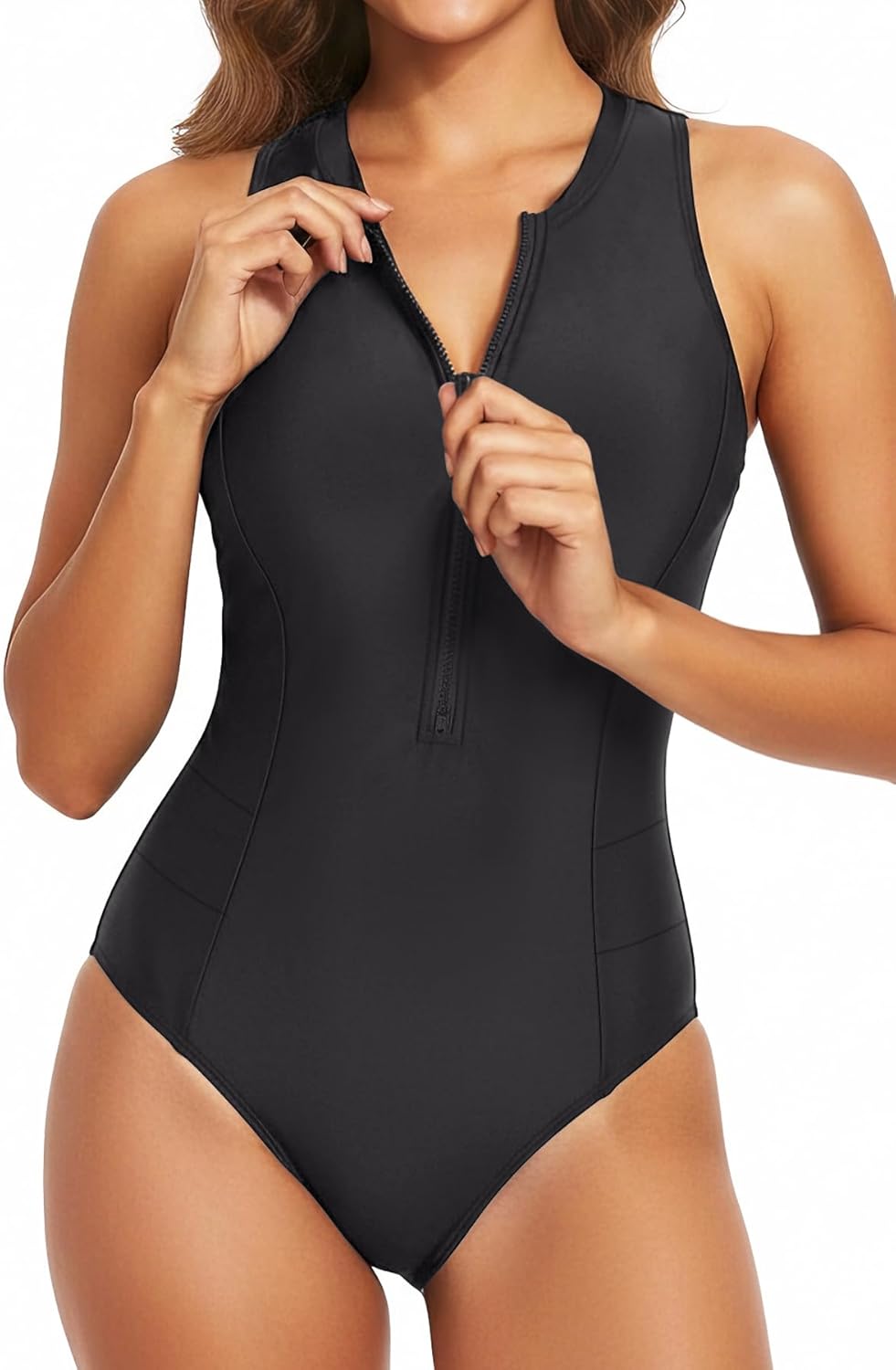 Tempt Me Women Athletic One Piece Swimsuit Zipper High Neck Bathing Suit Racerback Swimwear