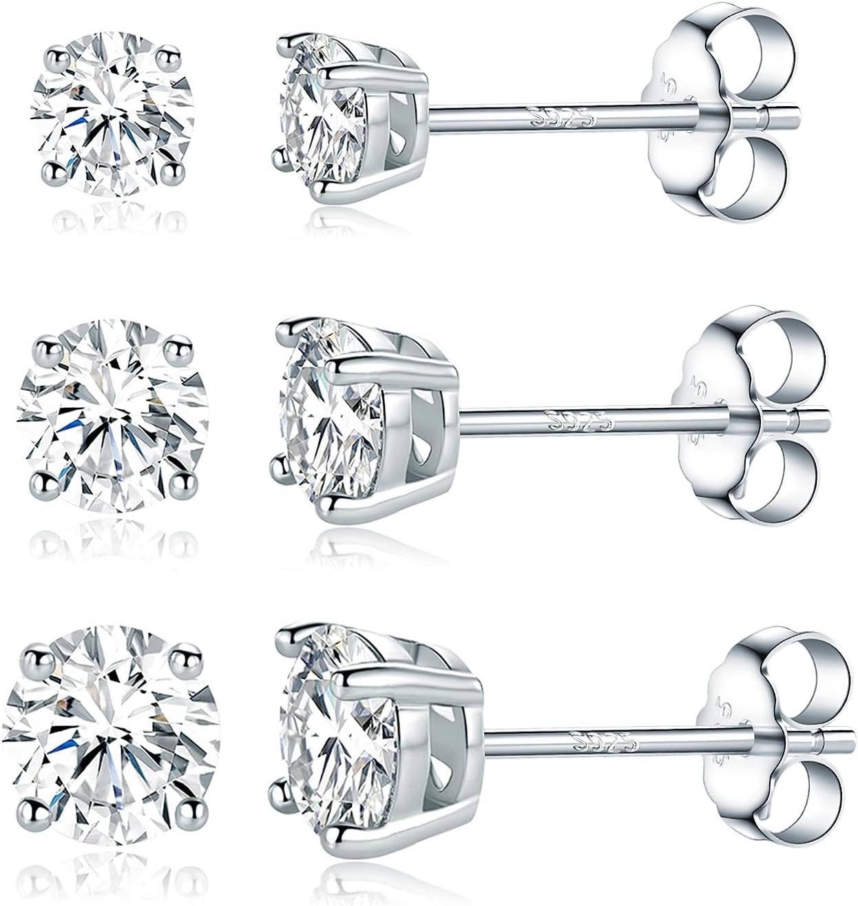 GEMSME 925 Sterling Silver White/Yellow Gold Plated 4 Pong Round Clear Moissanite Stud Earring for Women 3/4/5mm Pack of 3 Pairs
