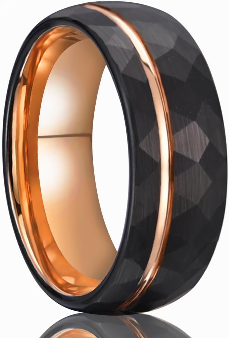 Tungsten Carbide Rings for Men Women 8mm Black Hammered Men's Engagement Wedding Bands Rose Golden Groove Matte Brushed Comfort Fit