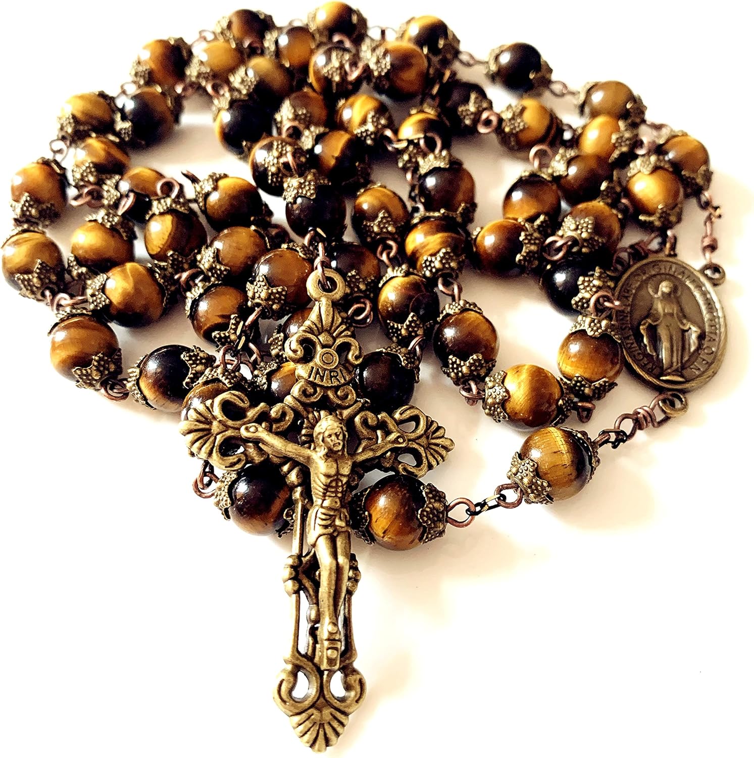 elegantmedical HANDMADE Tiger Eye Beads 5 DECADE ROSARY Bronze CROSS CATHOLIC NECKLACE GIFT