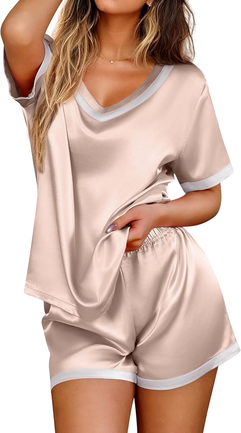 Ekouaer Silk Pajamas for Women Short Sleeve Satin Sleepwear Soft 2 Piece Pjs Shorts Set Loungewear,S-XX