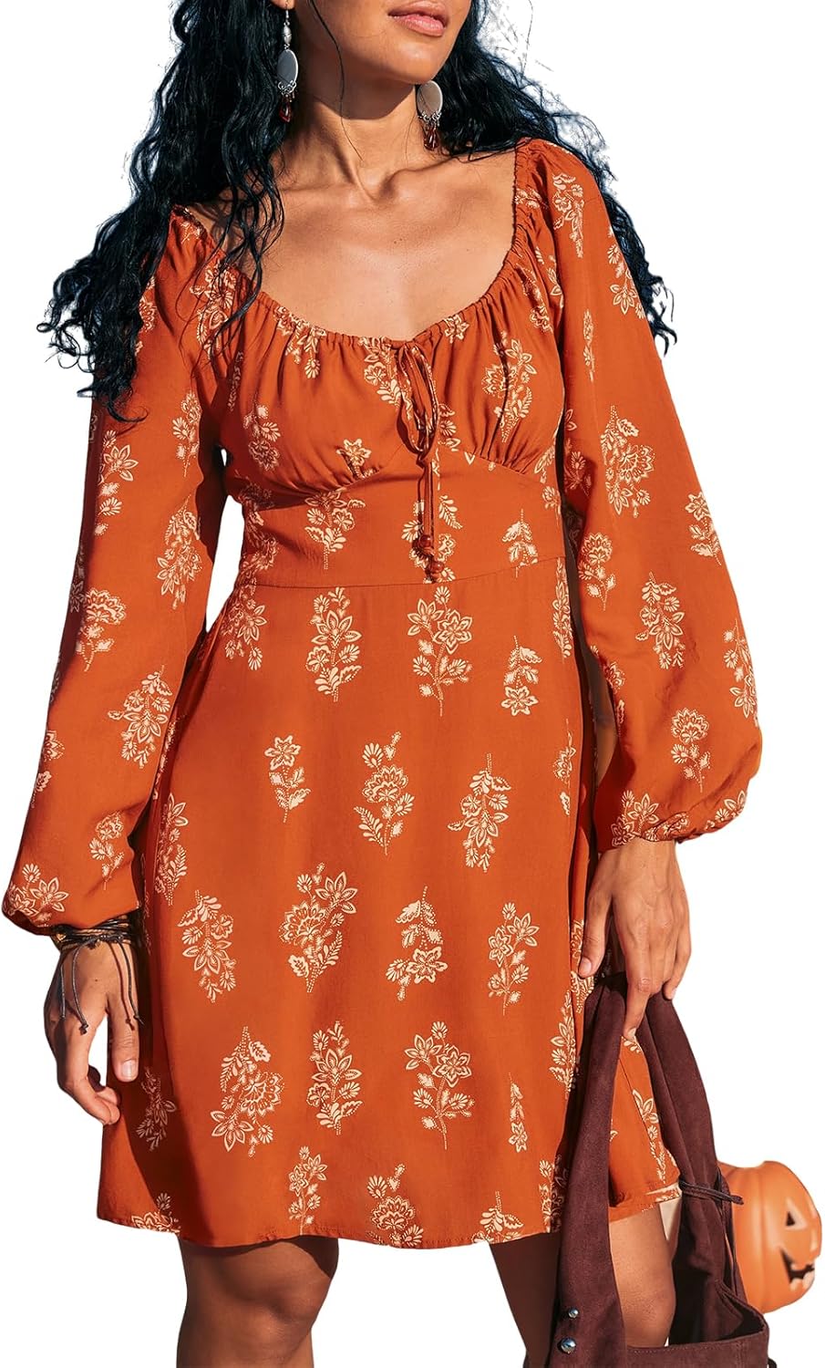 CUPSHE Women's Fall Dresses Long Sleeve Scoop Neck Casual Drawstring Floral High Waist Elegant Party Mini Dress