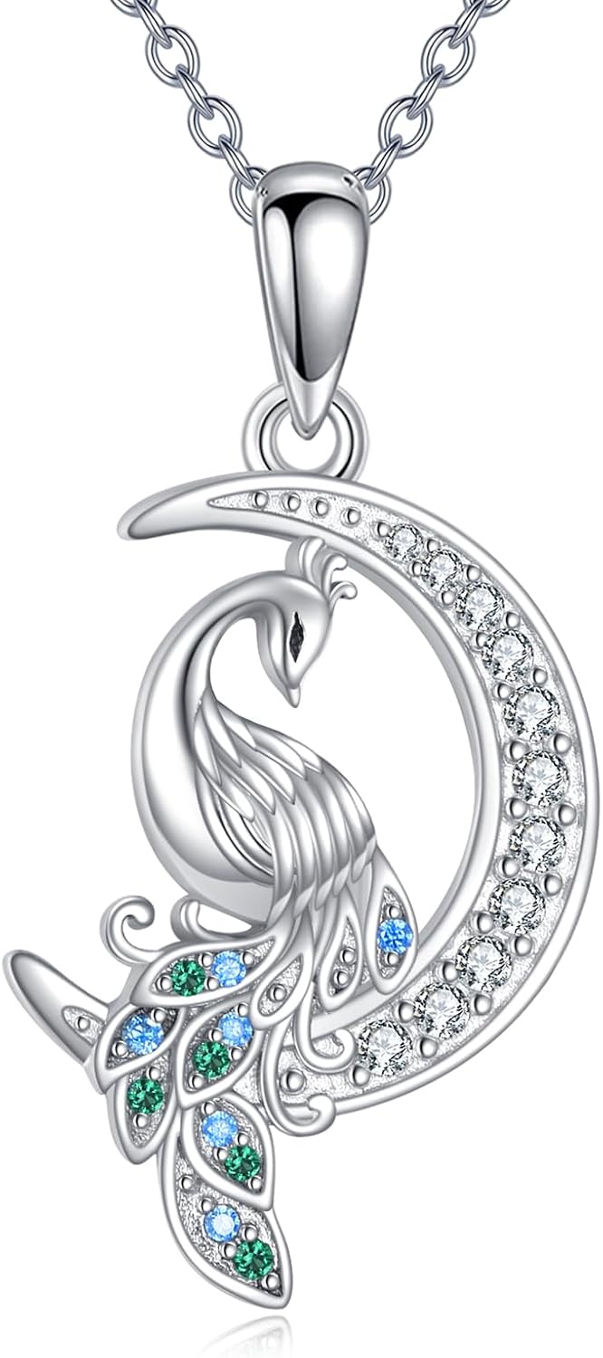Peacock Necklace Sterling Silver Moon Pendant Animal Jewelry Gifts for Women