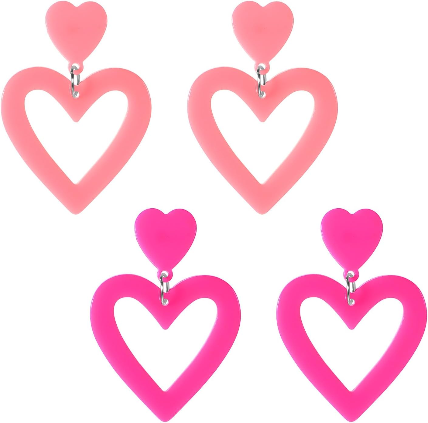 2 Pairs Heart Earrings, Heart Dangle Earrings for Women, Acrylic Double Hearts Drop Earring for Gifts (Hot Pink, Rose Red)