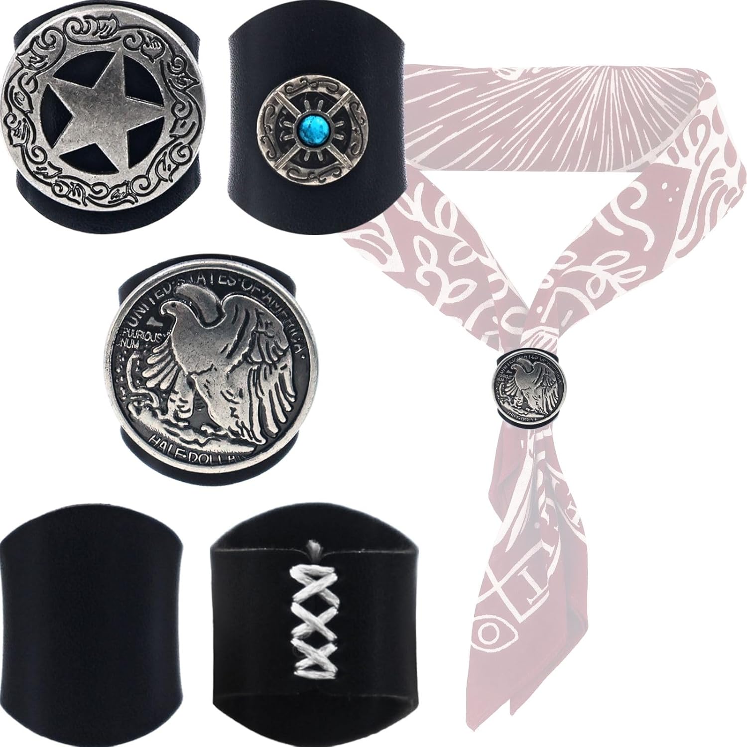 PEARLY JUN Bandana Ring 4Pcs Scarf Slide Western Bandana Scarf Ring Neckerchief Slide for Men Women Silk Scarves Cowboy
