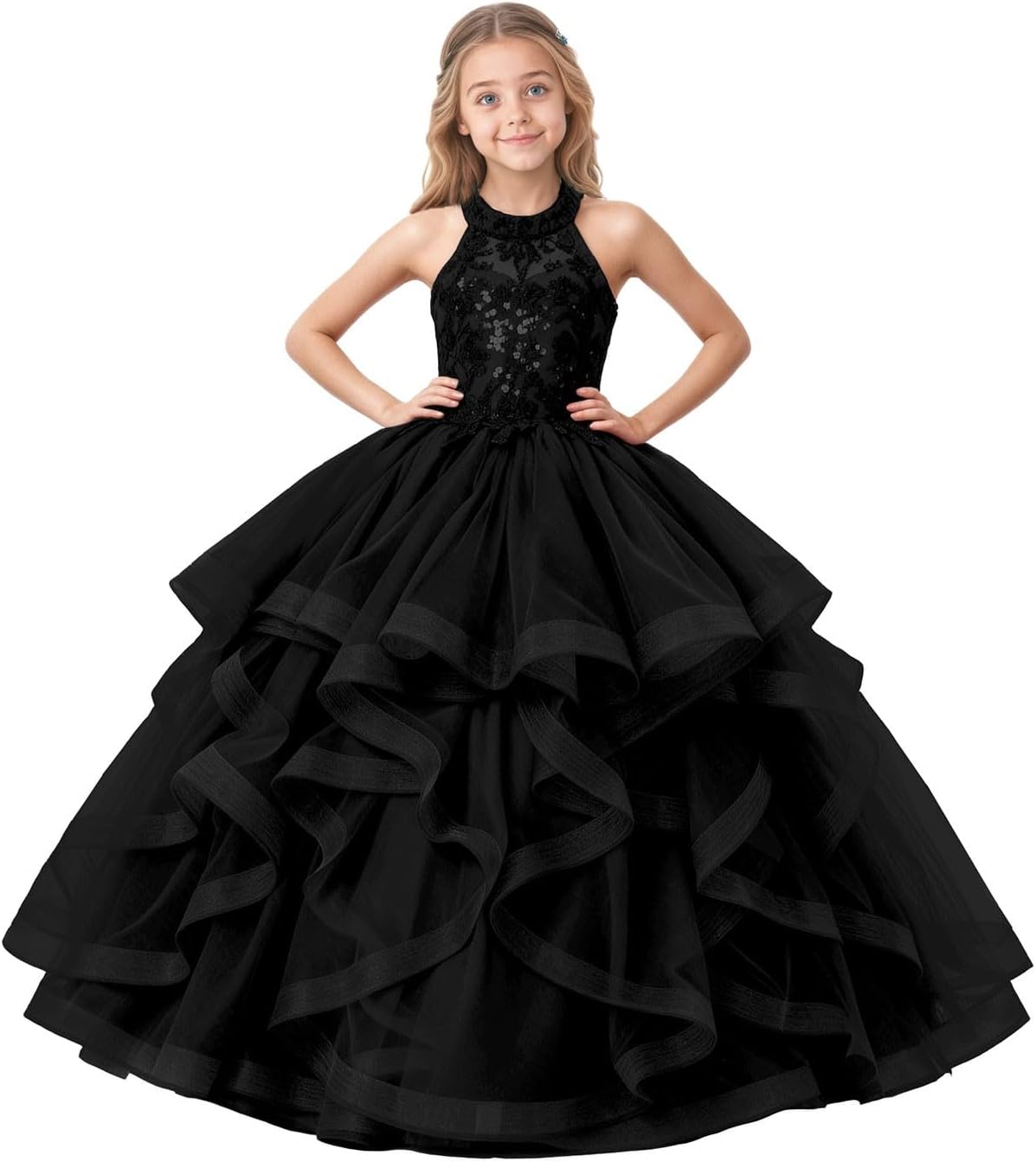 Tulle Flower Girl Dress Sparkly Sequins Applique Pageant Dresses for Girls Halter Neck Tiered Formal Girls Ball Gown