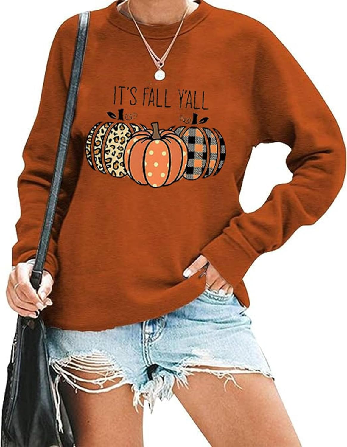 It's Fall Y'all Leopard Plaid Dot Pumpkin Sweatshirt Women's Halloween Long Sleeve Casual Pullover Tops