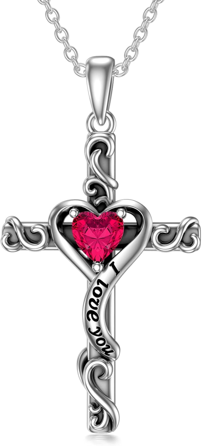 TOUPOP Valentines Day Gifts for Her Birthstone Cross Necklace for Women 925 Sterling Silver Heart Cross Pendant I Love You Jewelry Anniversary Birthday Gifts for Wife Girlfriend Mom