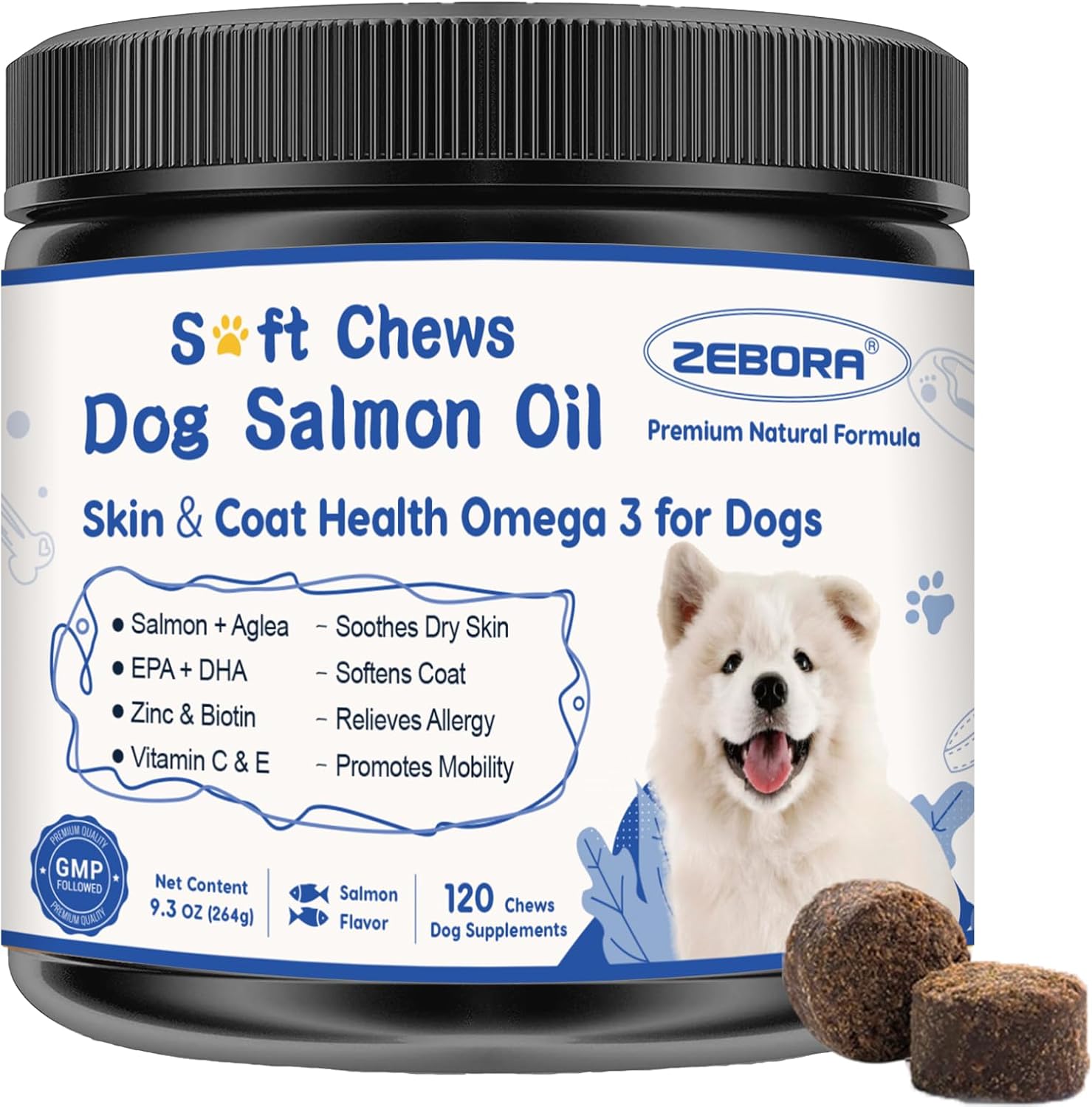 ZEBORA Salmon Oil for Dogs Skin and Coat - Omega 3 6 9 Fish Oil Soft Chews for Dogs Itchy Skin Relief - Dog Fish Oil Supplements EPA DHA Rich with Vitamins C & E - Allergy Relief & Shedding, 120 Ct