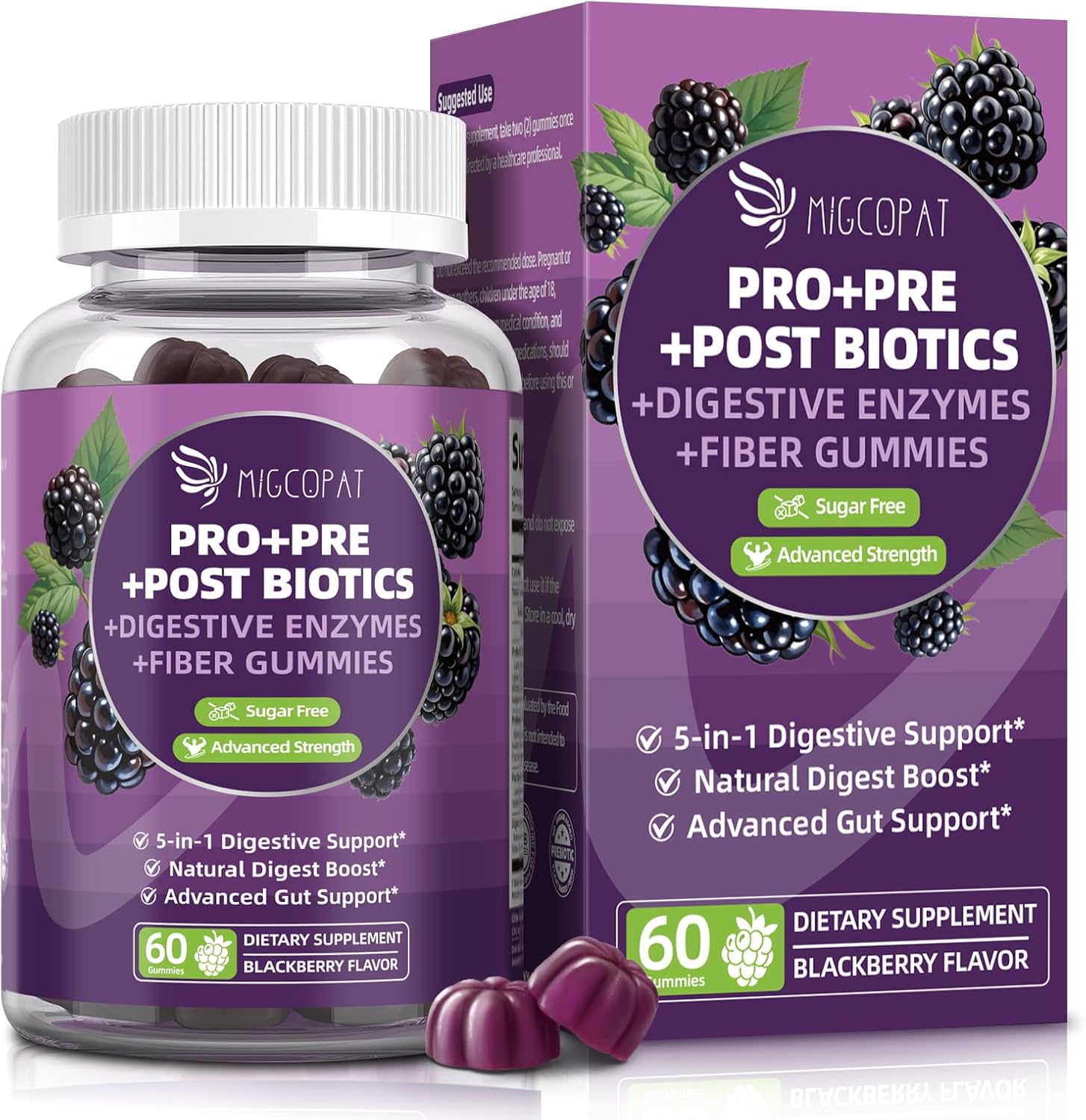 Pre Post Probiotics Gummies, 5 in 1 Probiotic Prebiotic Postbiotic Digestive Enzymes with Fiber, 120 Billion CFU Probiotics Complete Gut Support, Sugar Free, Vegan, BlackBerry Flavor, 60 Cts