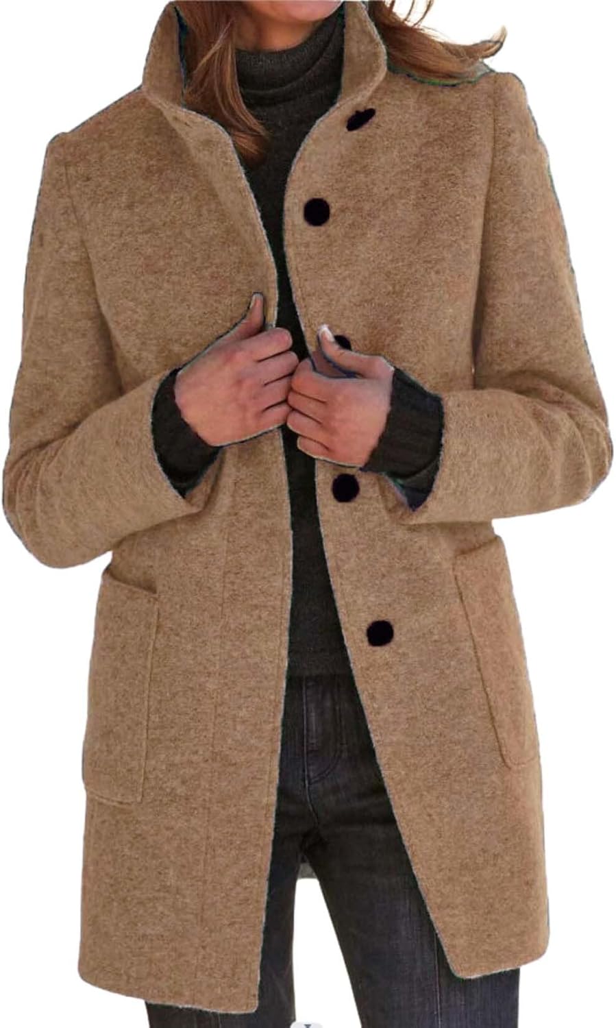 Womens Winter Long Vintage Solid Color Coat Wool Blend Standing Collar Button Thickened Jacket