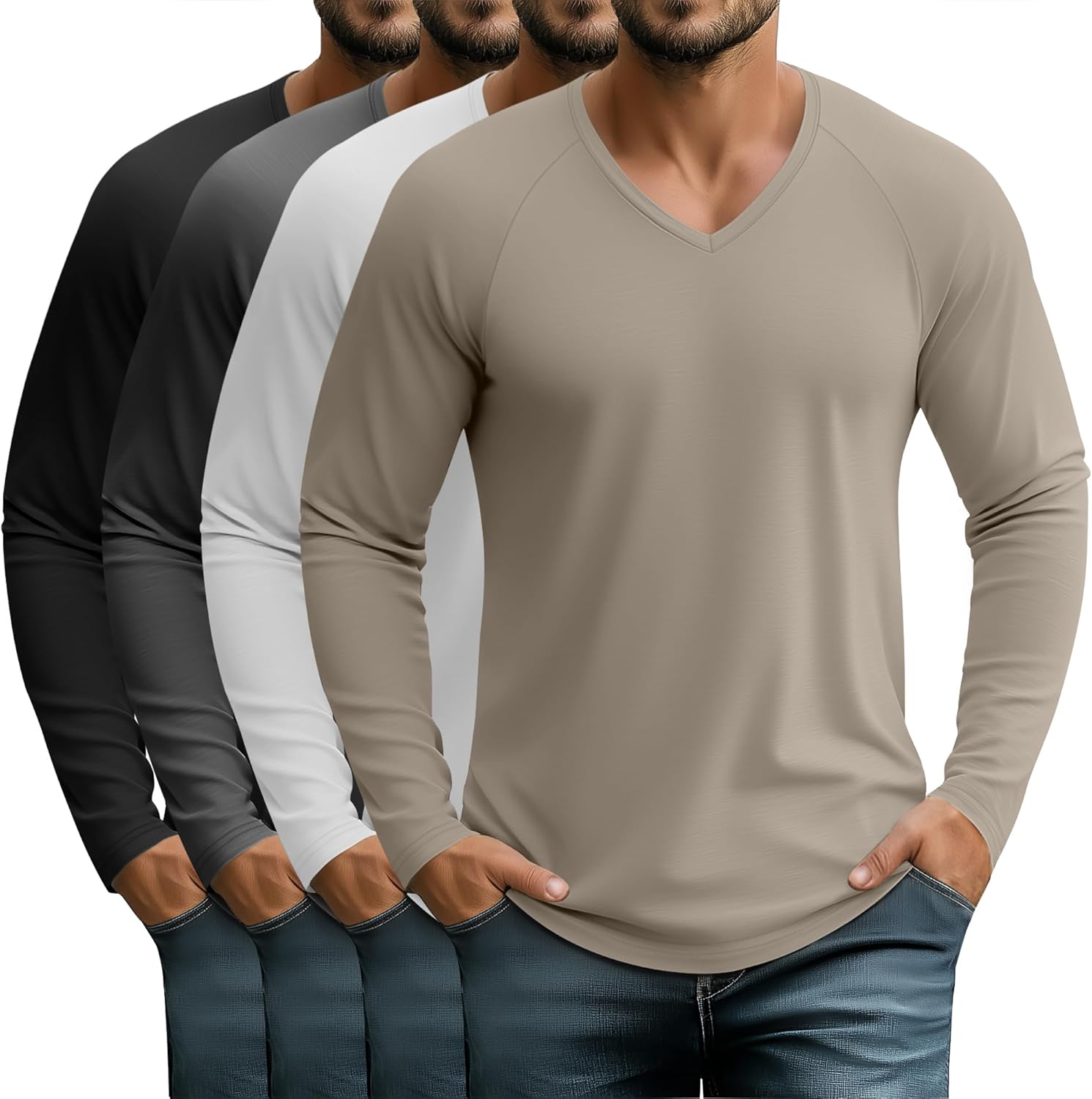 4 Pcs Mens Long Sleeve V Neck Shirts Raglan Sleeve Curved Hem Tees Lightweight Casual Basic Workout T Shirts