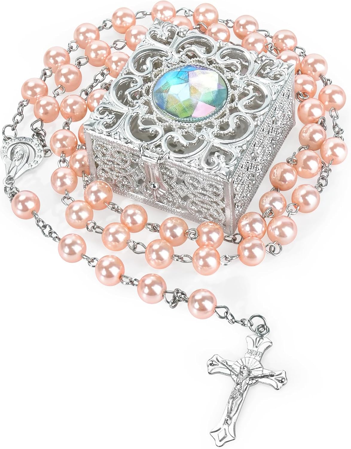 8mm Rosary Beads Necklace, Rosary Beads Catholic for Men and Women Comes in a Metal Gift Box, First Communion Rosary Necklace as Gifts(Pink)