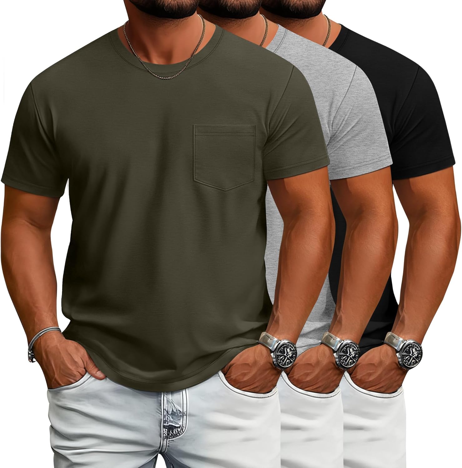 Ficerd 3 Pack Men's Big and Tall T Shirt, Short Sleeve Pocket Cotton Tee Crew Neck Lightweight Tops Solid Loose Fit Shirts(Black, Army Green, Light Mixed Gray,4X-Large)