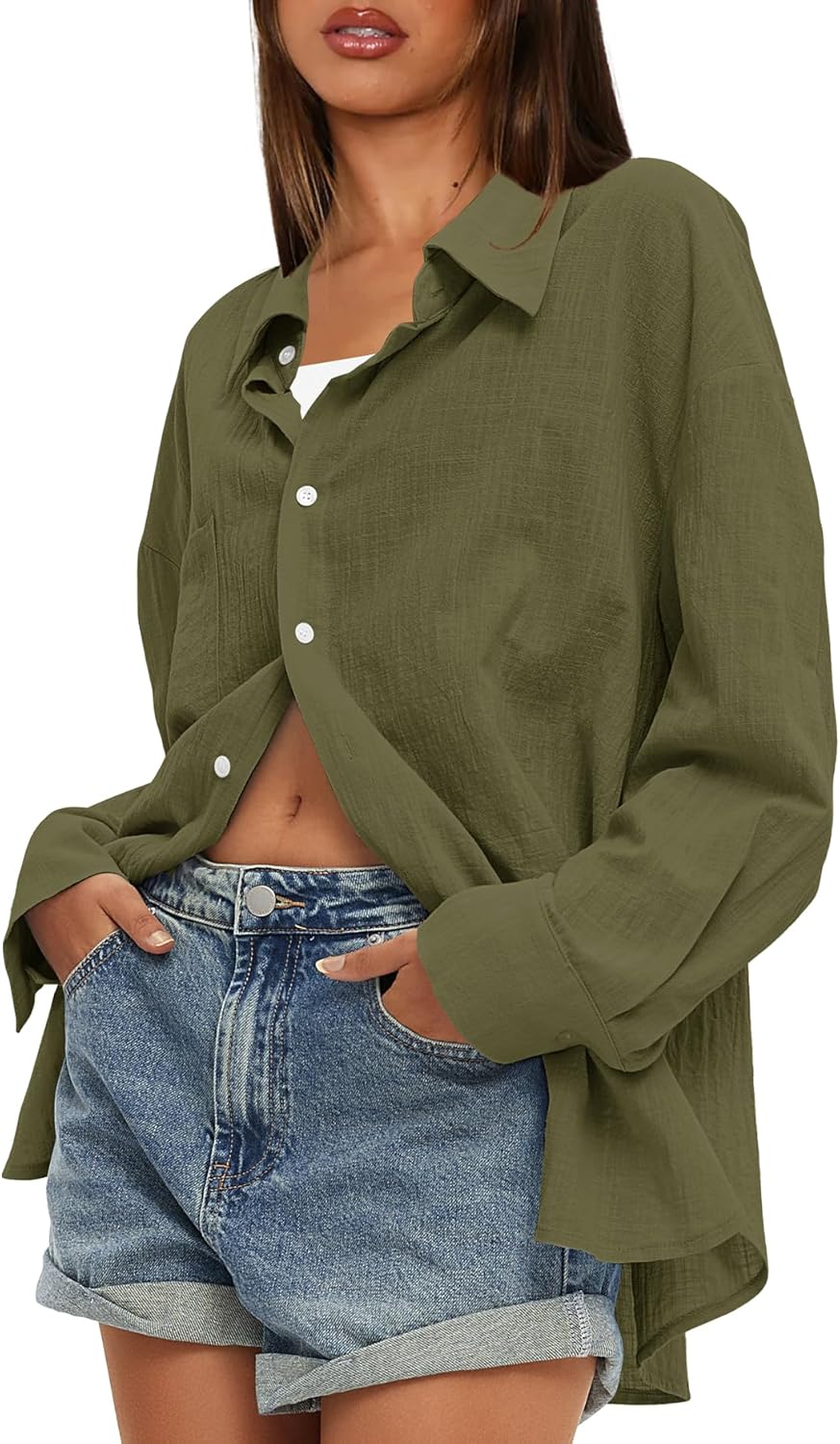 Darong Womens Button Down Shirts Cotton Dress Shirts Long Sleeve Work Blouses Collared Tops Tunics with Pocket 9214 Army Green S