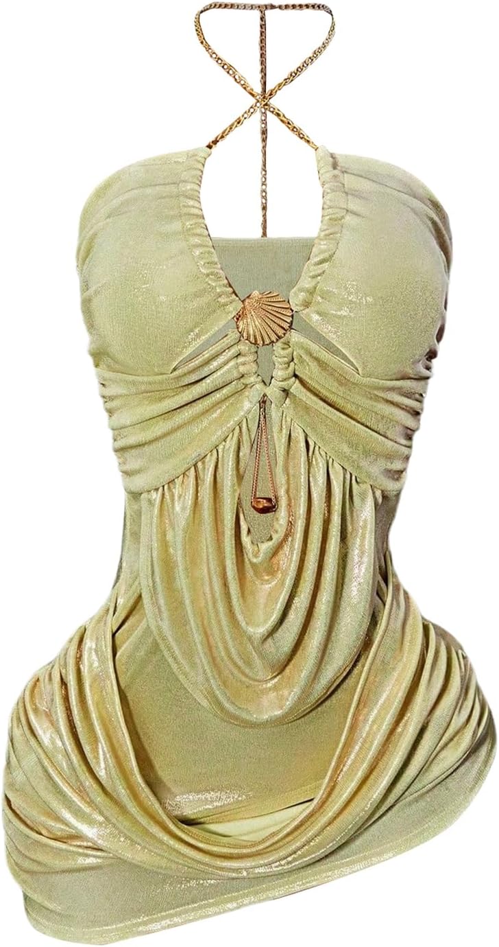 Women's Ruched Halter Mini Dress Summer Chain Cut Out Bodycon Asymmetrical Party Club Dresses