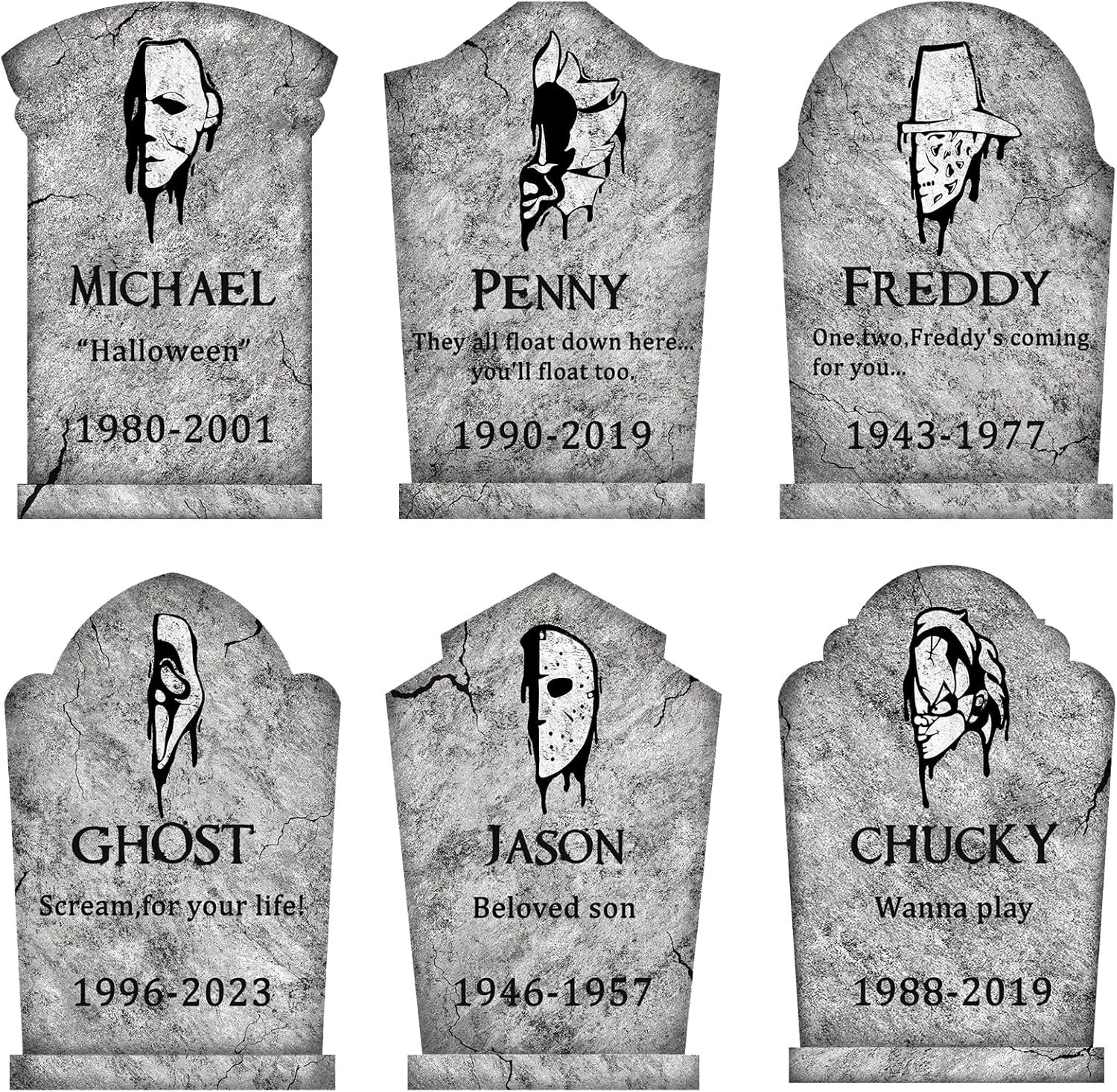 - SCARY DESIGN: Each tombstone showcases a unique, scary face of classic horror films with creepy details and stone texture printed. Enhance the spooky atmosphere of your Halloween decorations outdoor with realistic and chilling visuals. (Flat, just 3D visual effect)