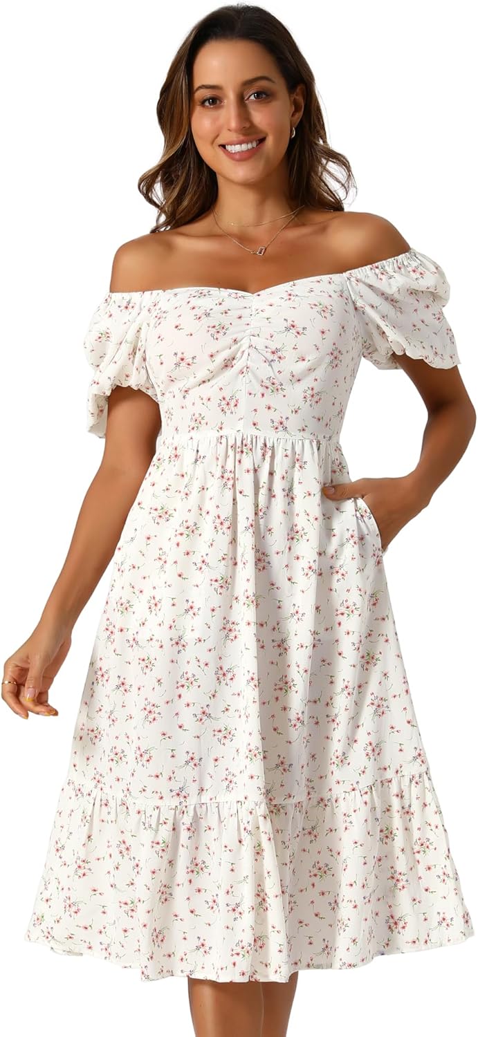Allegra K Women's Boho Floral Print Summer Dresses Square Neck Puff Short Sleeve A-Line Casual Midi Dress