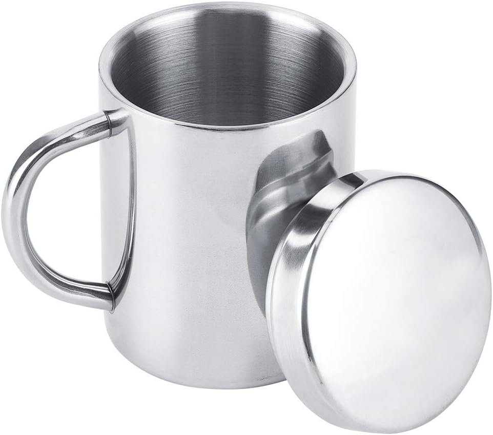 - LEAKPROOF LID & ERGONOMIC HANDLE: Metal coffee mugs include snap lid for spill-proof portability. Contoured handle (10.5cm/4.1in height) ensures comfortable grip during office commutes or camping trips