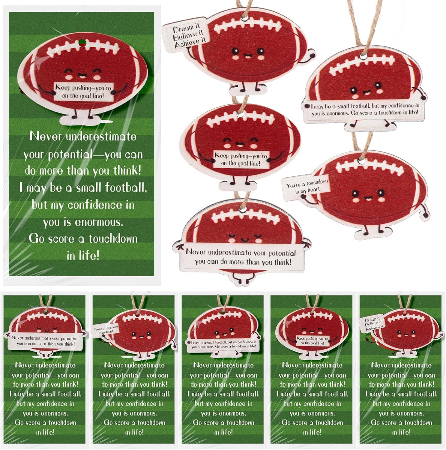 - Stunning Package Display: the football sport gift set includes 20 football wooden hanging ornaments in classic sports themed patterns in 5 styles, 20 jute ropes, 20 inspirational cards and 20 opp bags, The nice combination is convenient for you to write your blessing on the card and give it to your coach, teammates, friends, students and so on