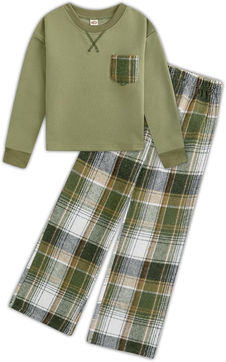 JiAmy Girls Clothes Solid Long Sleeve Tops Plaid Wide Leg Pants With Pockets 2 Pcs Outfits Size 5-14