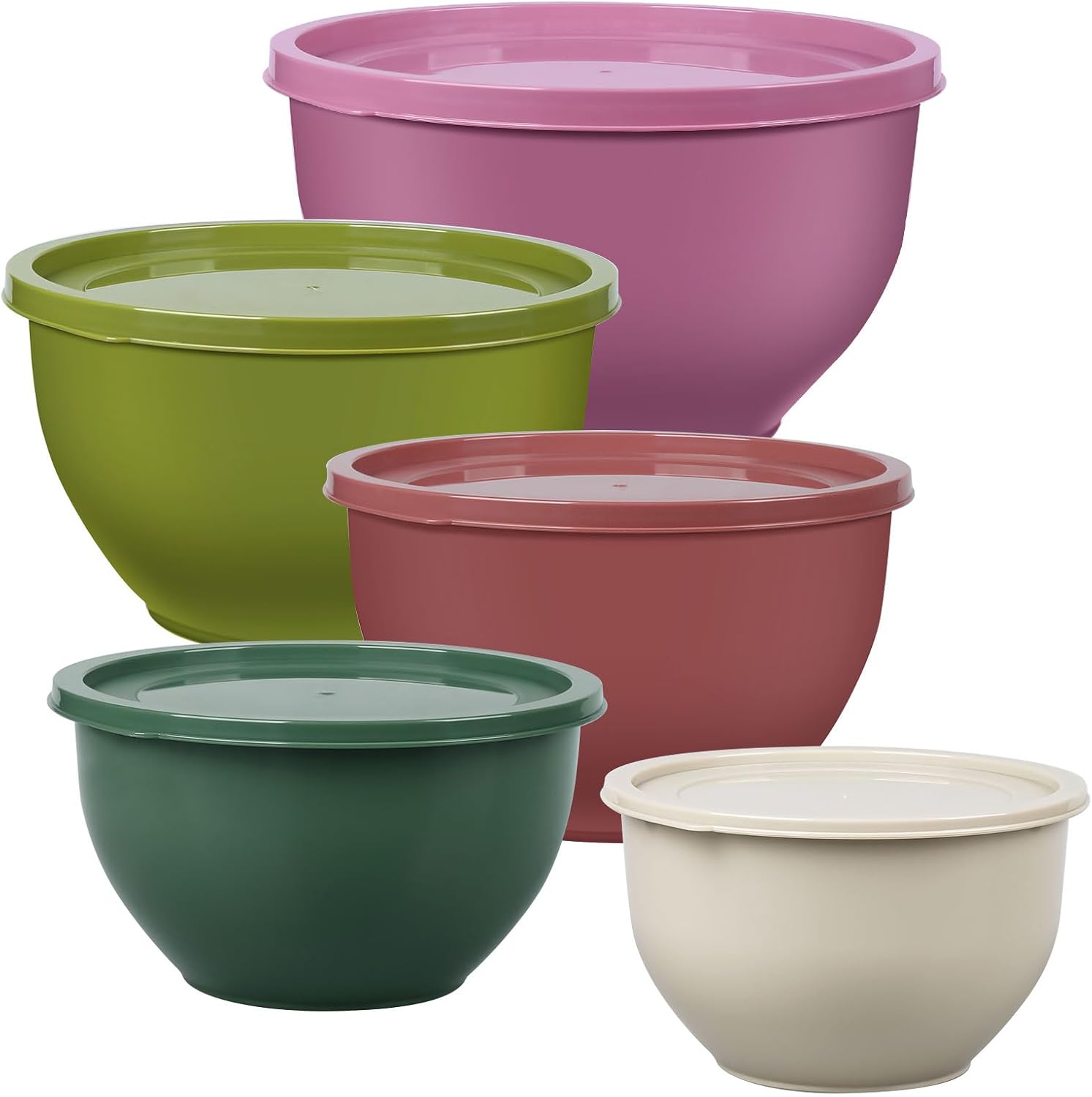 - 🍓【Multi-use to Meet Your Needs】- Mixing bowl set with lids includes 5 sizes (0.85/1.37/2.33/3.38/5QT), making it easy to find the right serving bowls for any kitchen task or food storage containers need. The nesting bowls are perfect for mixing, stirring, preparing, and serving food, making this plastic bowls the perfect set for a variety of prep, baking, and home entertaining styles.