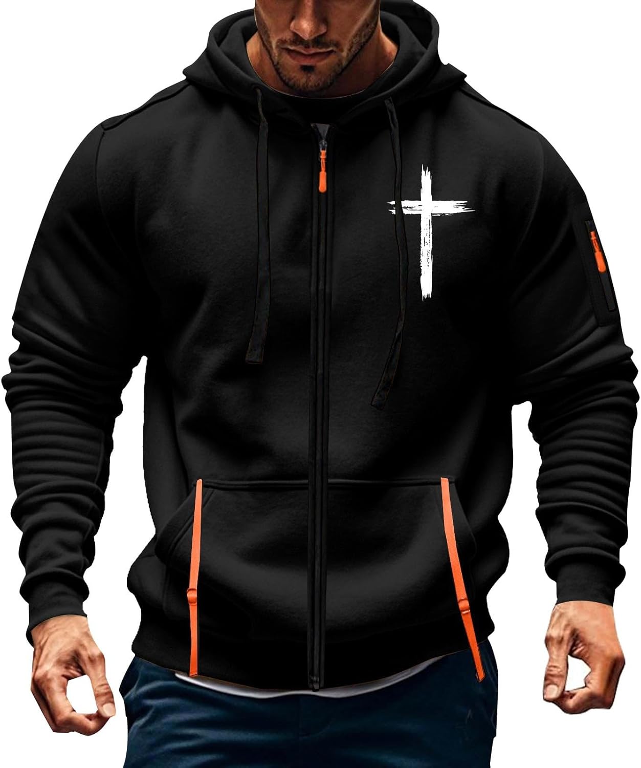 Full Zip Hoodies for Men Cross Religious Christian Graphic Shirt Long Sleeve Spring Sweatshirts with Zipper Pocket