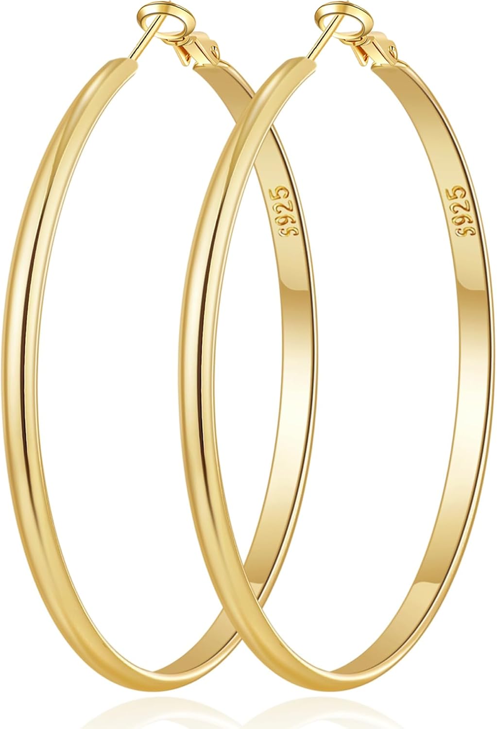 EXGOX 5mm Wide Gold Hoop Earrings for Women,Sterling Silver Hoop Earrings Large Silver Hoop Earrings Hypoallergenic Lightweight 14K Real Gold Plated Big Hoop Earrings for Women 30/40/50/60/70mm
