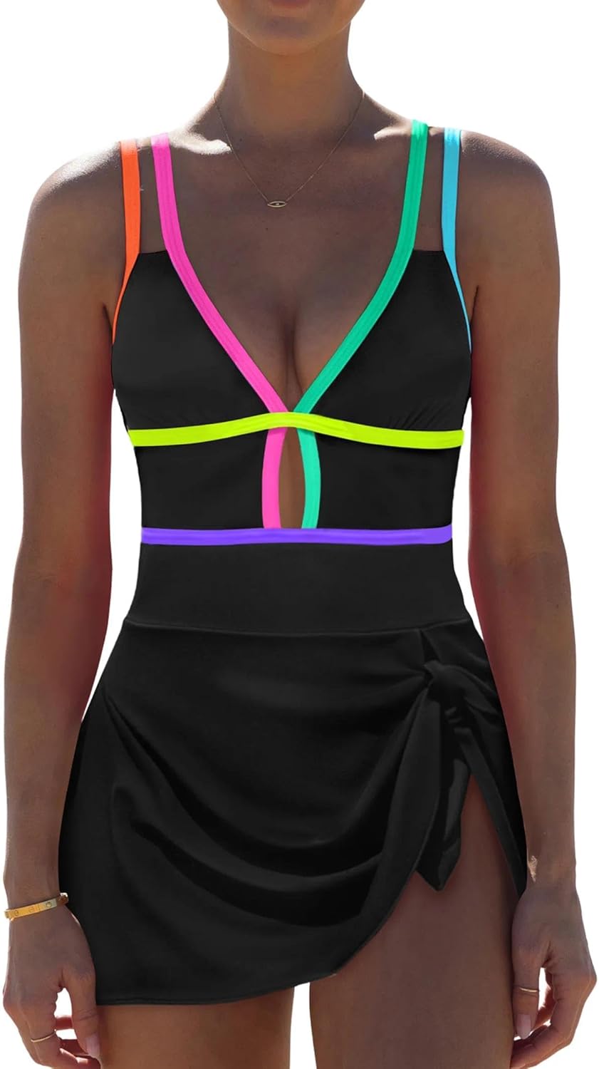 popvil Womens One Piece Swimsuit 2026 Swim Dress Tummy Control Sexy Bathing Suit Neon Swmming Suit