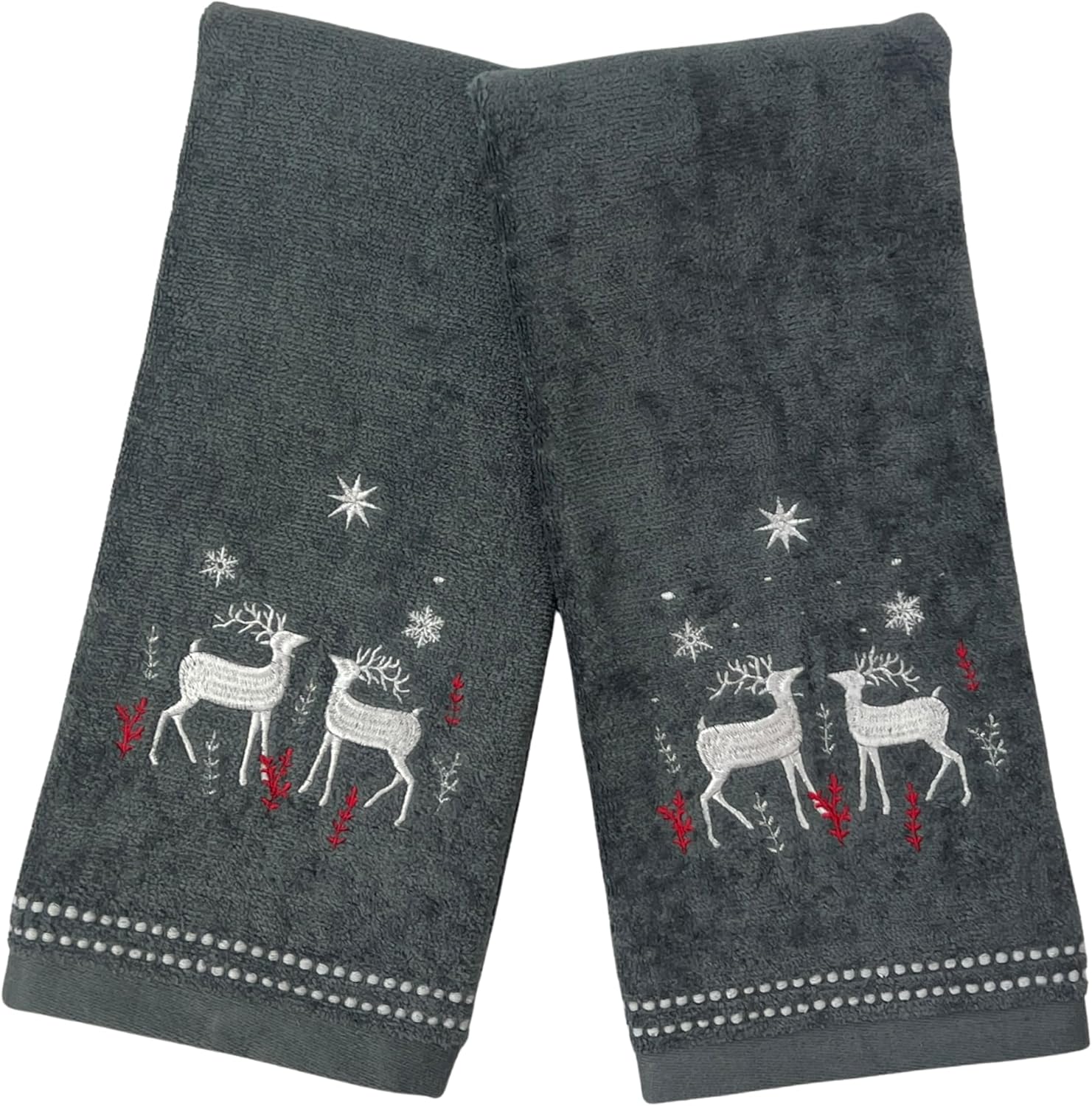 - ELEGANT HOLIDAY DESIGN: Featuring a Noble Reindeer Buck Deer design embroidered in shades of gray, silver, red, and white, these towels bring a refined festive charm to your bathroom or kitchen. The elegant color palette blends classic holiday warmth with modern sophistication, making them perfect for Christmas, winter, or cabin-inspired décor. The detailed embroidery adds texture and artistry that instantly elevates your space while staying subtle enough for year-round use.