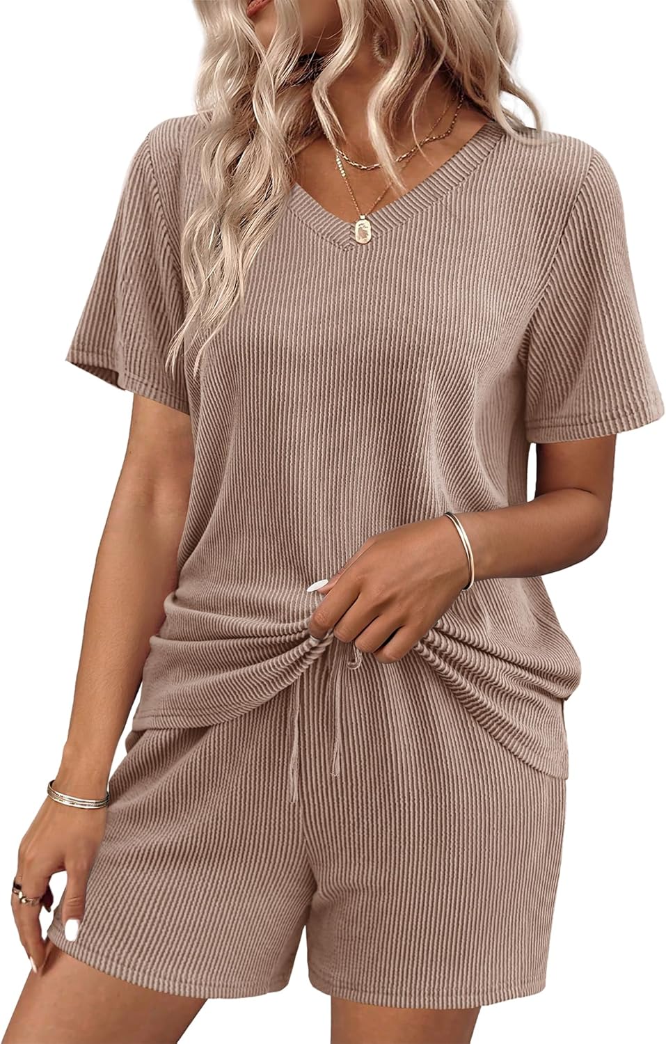 Ekouaer Womens Pajama Sets Short Sleeve Knit Lounge Set 2 Piece Pj Sets for Women V Neck Casual Loungewear