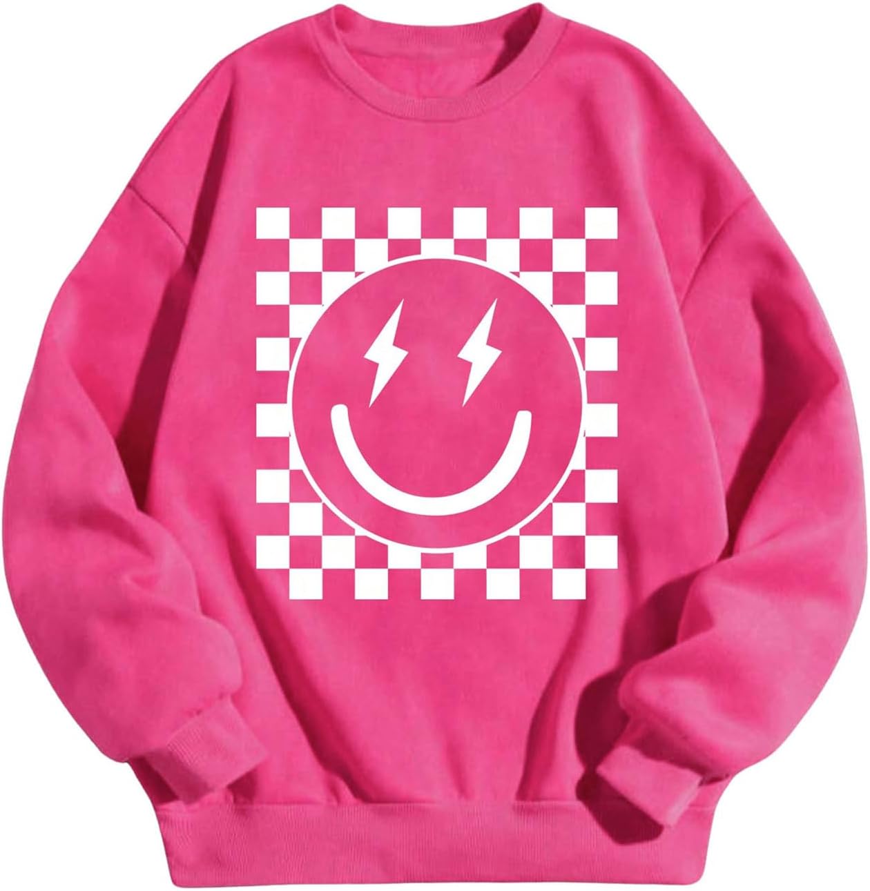 SHENHE Girl's Sweatshirt Checkered Smiley Face Graphic Cute Preppy Crewneck Sweatshirt Pullover Top Fall