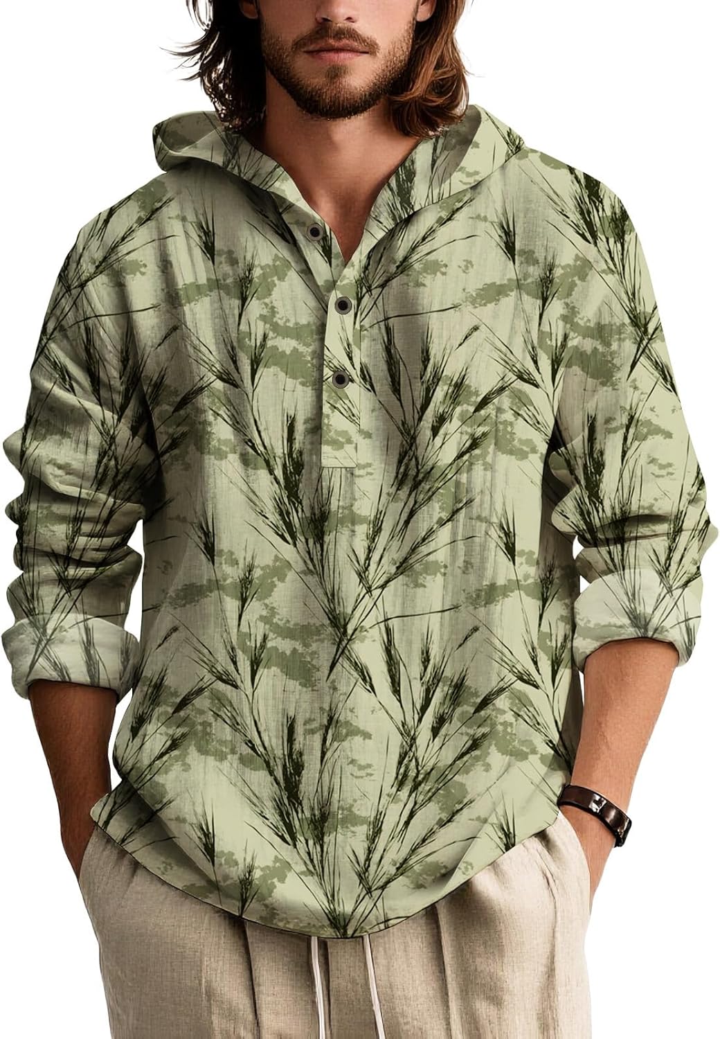 Mens Long Sleeve Hooded Shirt Botanical Print Lightweight Casual Pullover Button Neck Roll Up Sleeves Beach Wear