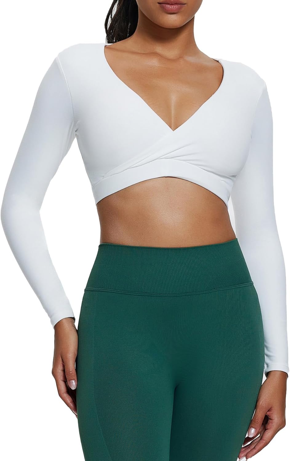 Aoxjox Leah Long Sleeve Crop for Women Deep V Half Cutout Workout Cropped T Shirt Top