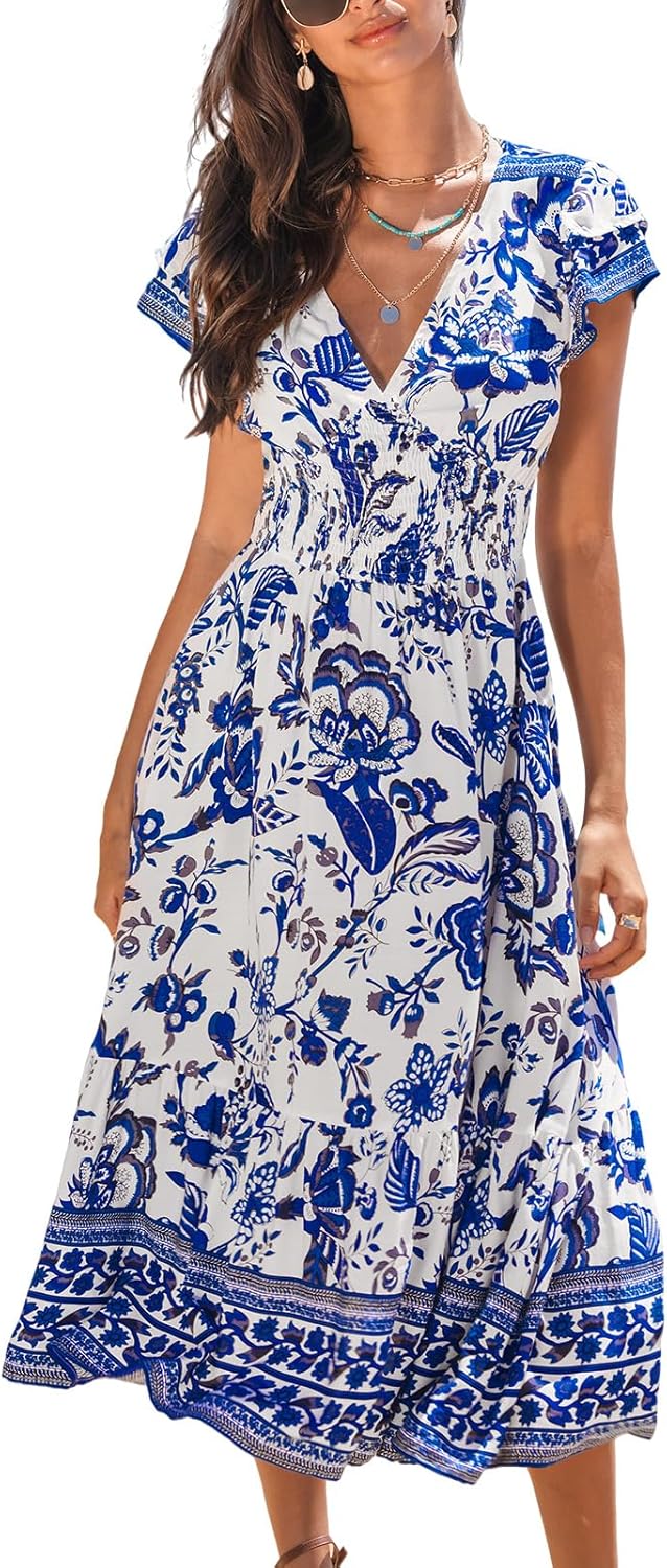 CUPSHE Women's Summer Dress Casual V Neck Floral Smocked Cap Sleeve Ruffled Vacation Midi Dress