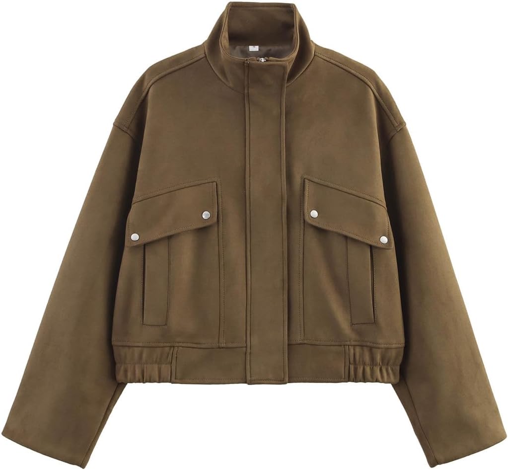 KEOMUD Suede Jacket Women Casual Cropped Bomber Jacket Stand Collar Zip Up Lightweight Outwear for Fall Winter