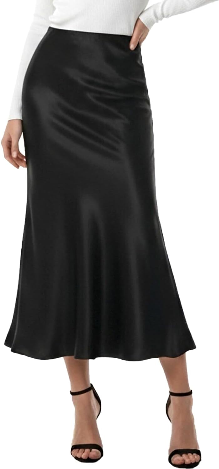 Women's Elegant Satin Skirt Long Silk High Waist Flared Cocktail Party Wedding Office Fishtail Midi Skirts