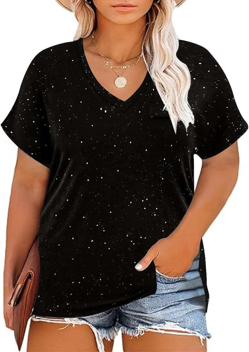 Plus Size Tops for Women Short Sleeve Shirts V Neck Split Hem Basic Tee Pullover Blouse XL-4XL