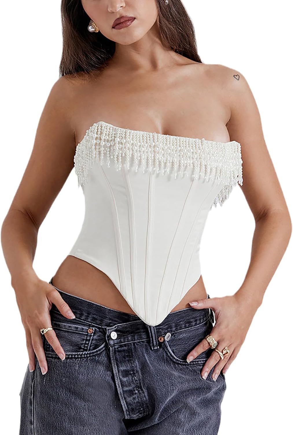 Women's Sexy Pearls Corset Top Strapless Zip Back Boned Y2k Bodyshaper Bustier Top