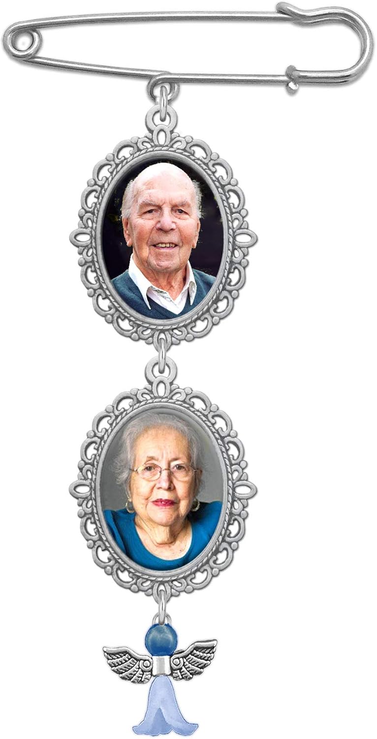 Something Blue Wedding Bouquet Photo Charm Double Frame Pin Lacy Oval Bridal Charm, Silver Plate