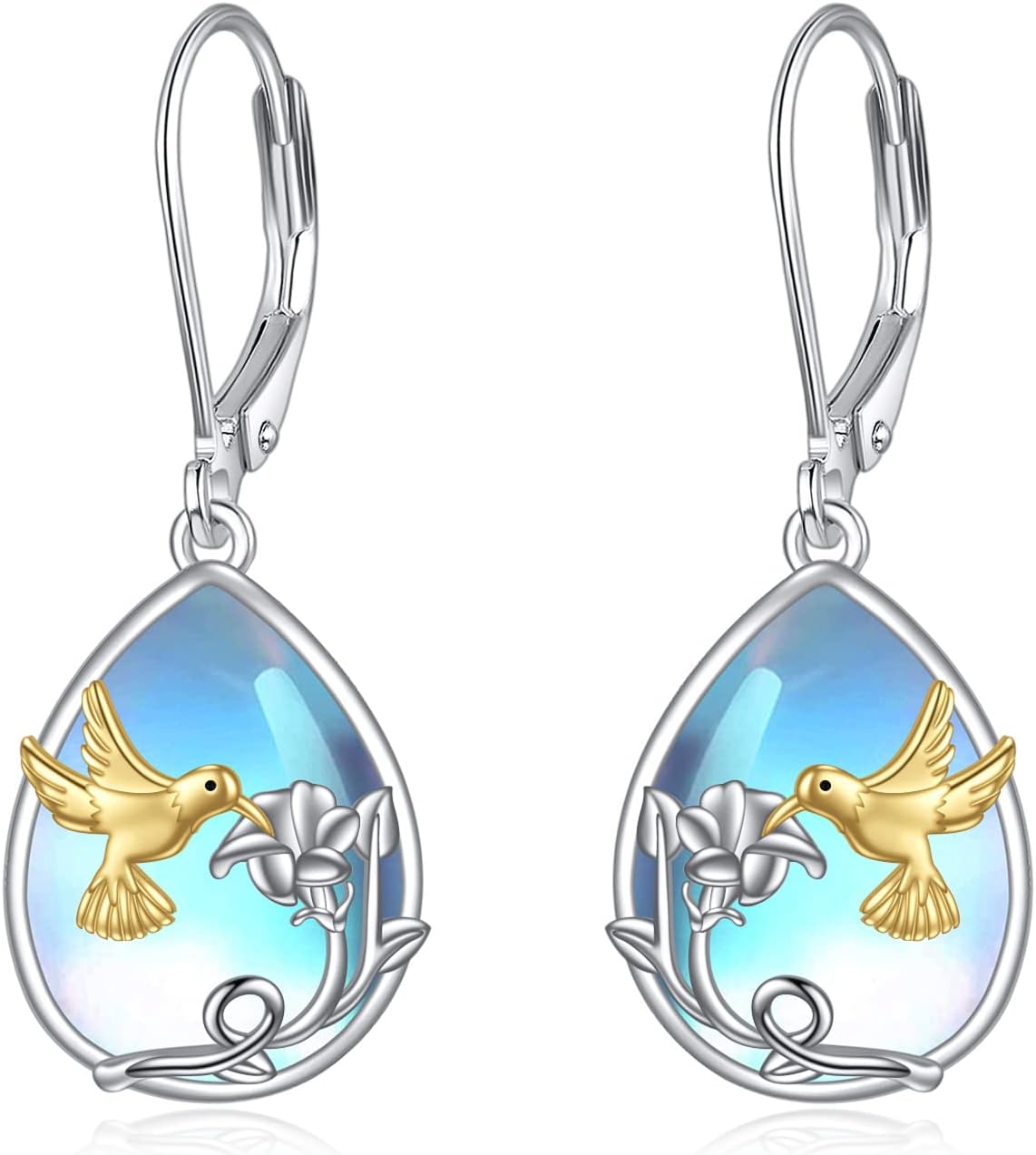 YFN Bee/Flower/Hummingbird Bird Moonstone Earrings 925 Sterling Silver Teardrop Dangle Hypoallergenic Leverback Earring for Women