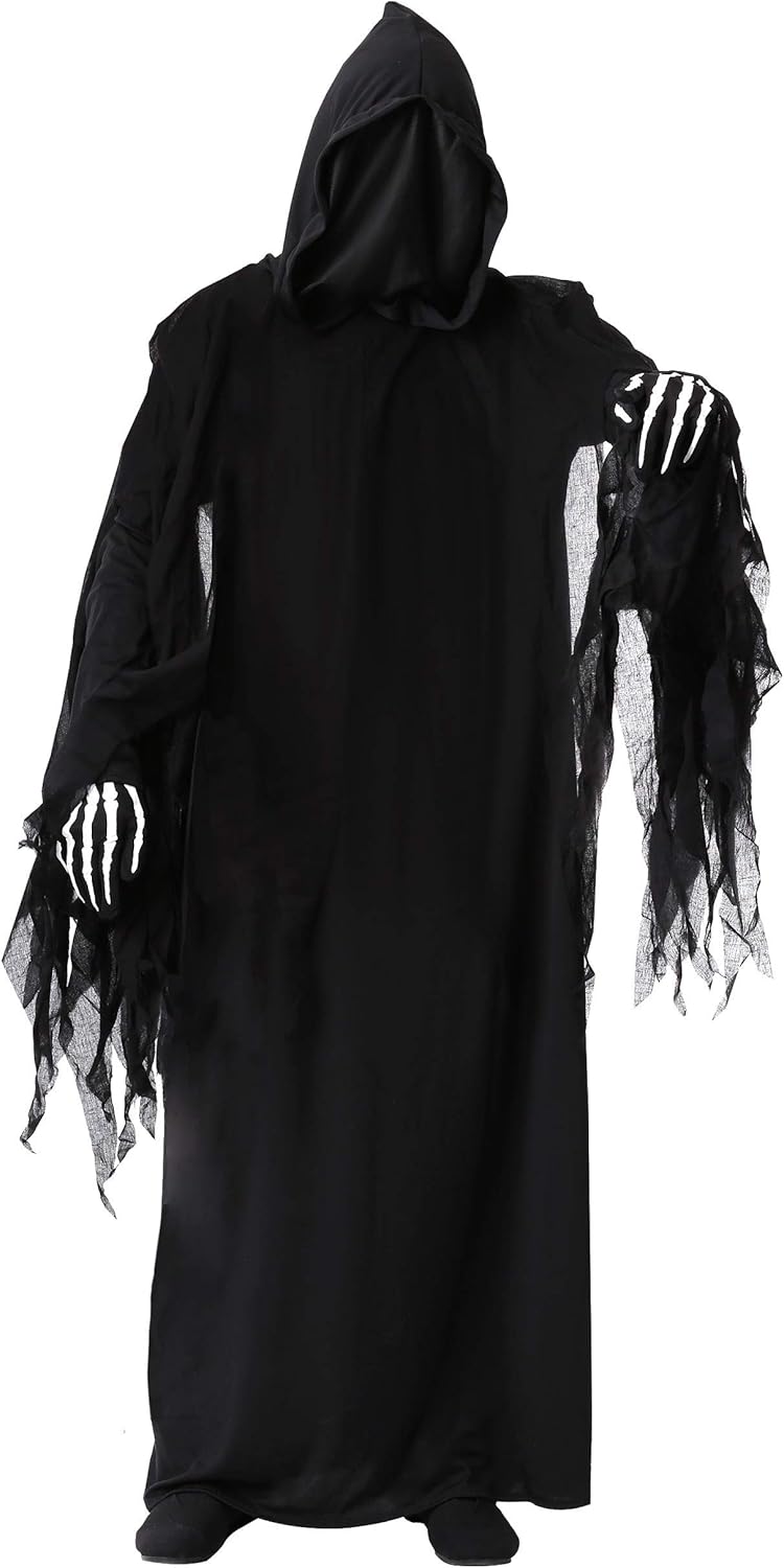 Creepy Grim Reaper Costume, Standard Mesh-Reinforced Hooded Robe with Skeleton Hands for Adults