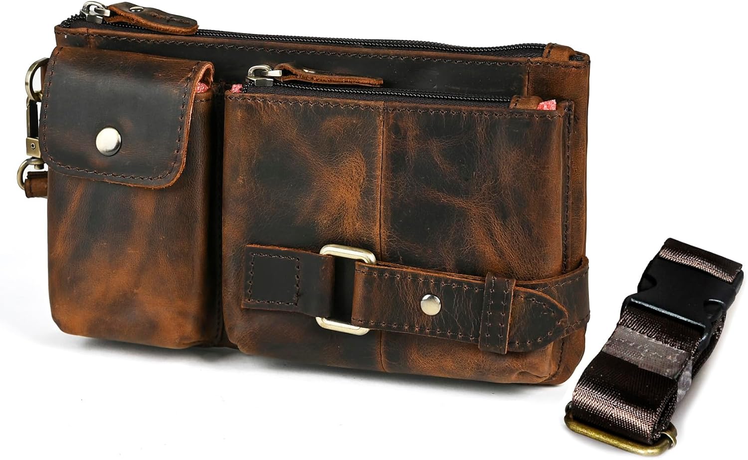- 【Quality Material】This waist bag is made of quality genuine crazy horse leather trim.The premium quality ensure the long lasting durability. The crazy horse leather is made of high-end top layer cowhide material, with a thickness of 2.0mm, which is solid and durable.And the quality solid hardware won’t gather rust easily.