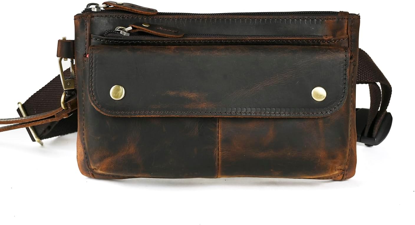 - 【Quality Material】This waist bag is made of quality genuine crazy horse leather trim.The premium quality ensure the long lasting durability.The crazy horse leather is made of high-end top layer cowhide material, with a thickness of 2.0mm, which is solid and durable.And the quality solid hardware won’t gather rust easily.