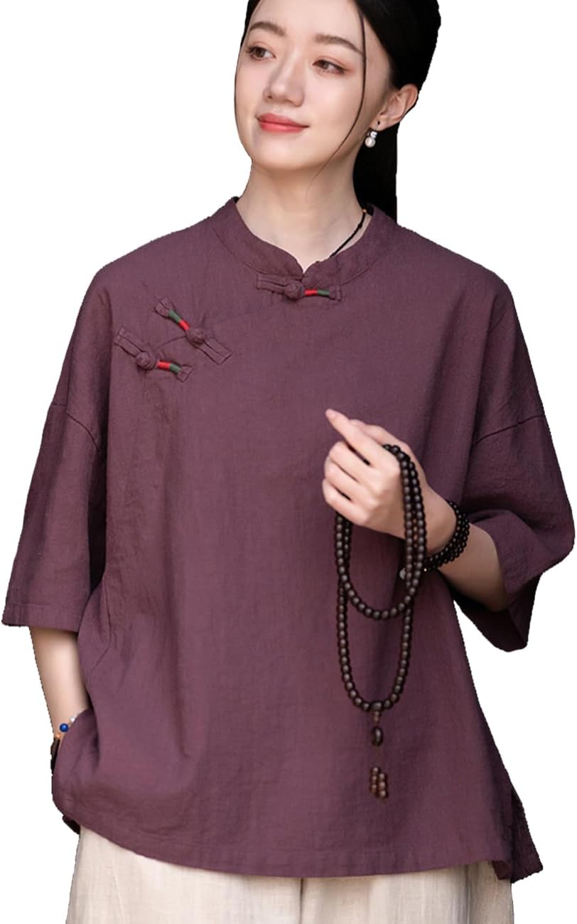 Women's Retro Chinese Frog Button Top Blouse Casual Loose Fit Half Sleeve Shirt