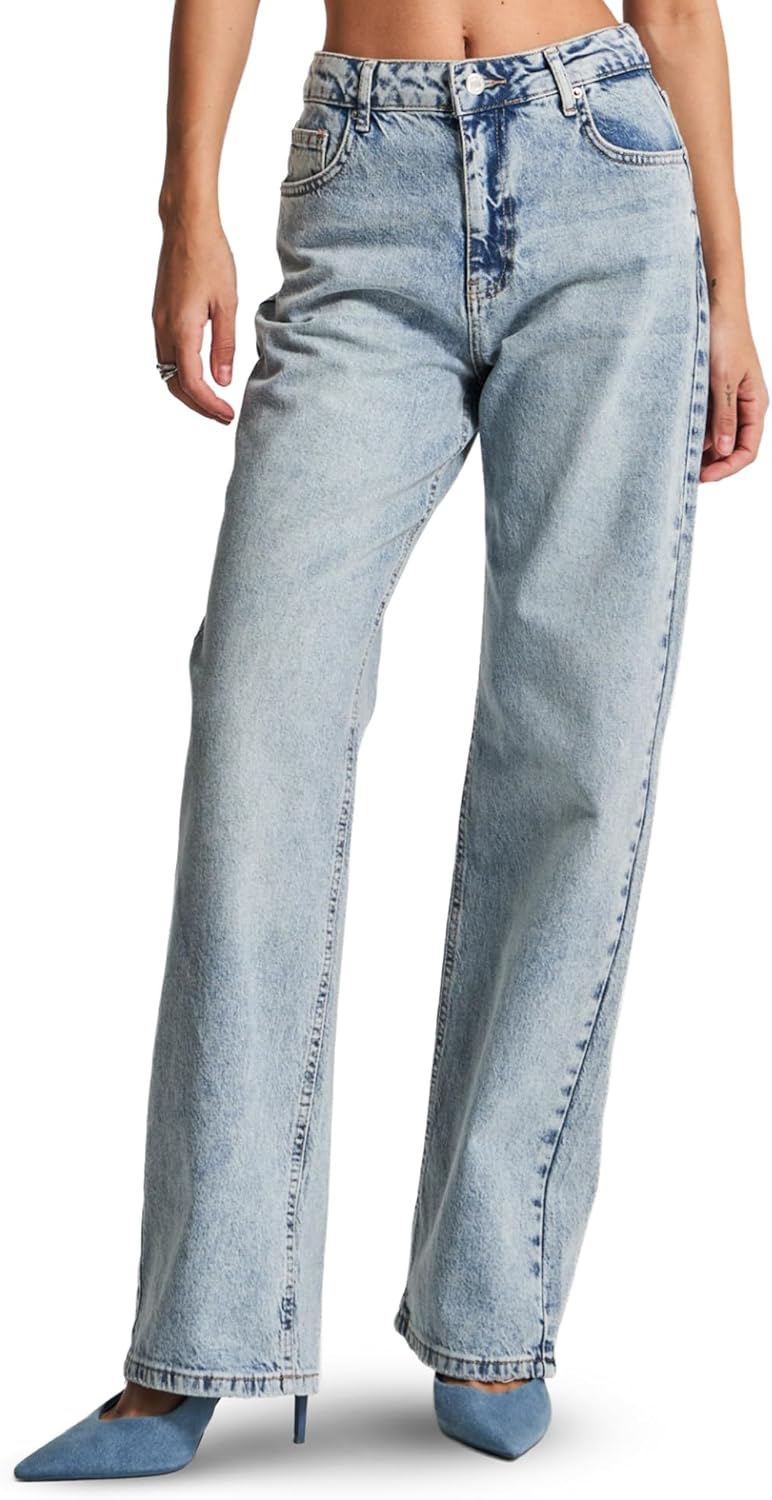 IT'S BASIC Straight Wide Leg Jeans for Women High Waisted, Relaxed Fit Trendy Womens Jeans Stretchy Denim Pants, Stonewashed