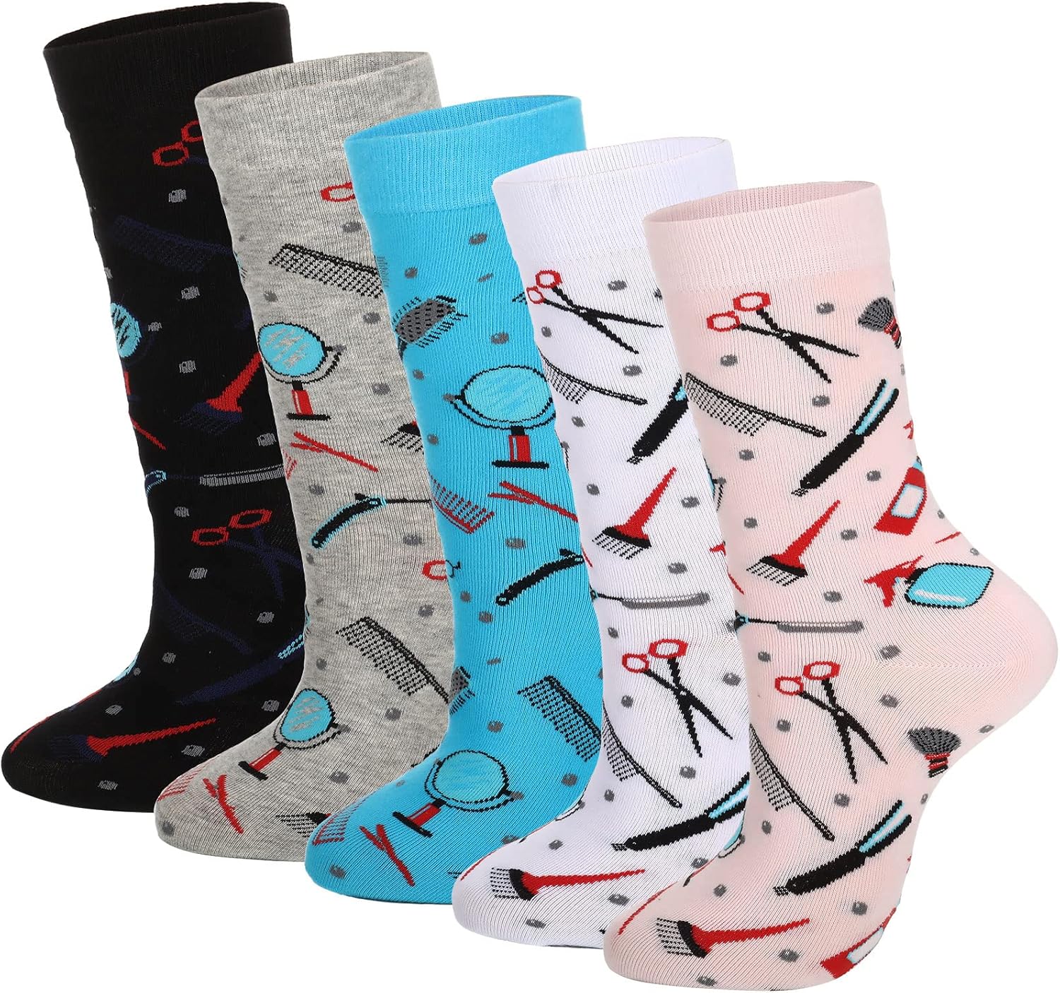 5 Pairs Funny Barber Socks - Christmas Gifts for Hairdresser, Hairstylist, Women & Men - Novelty Socks, 5 Colors, US 4.5-11.5