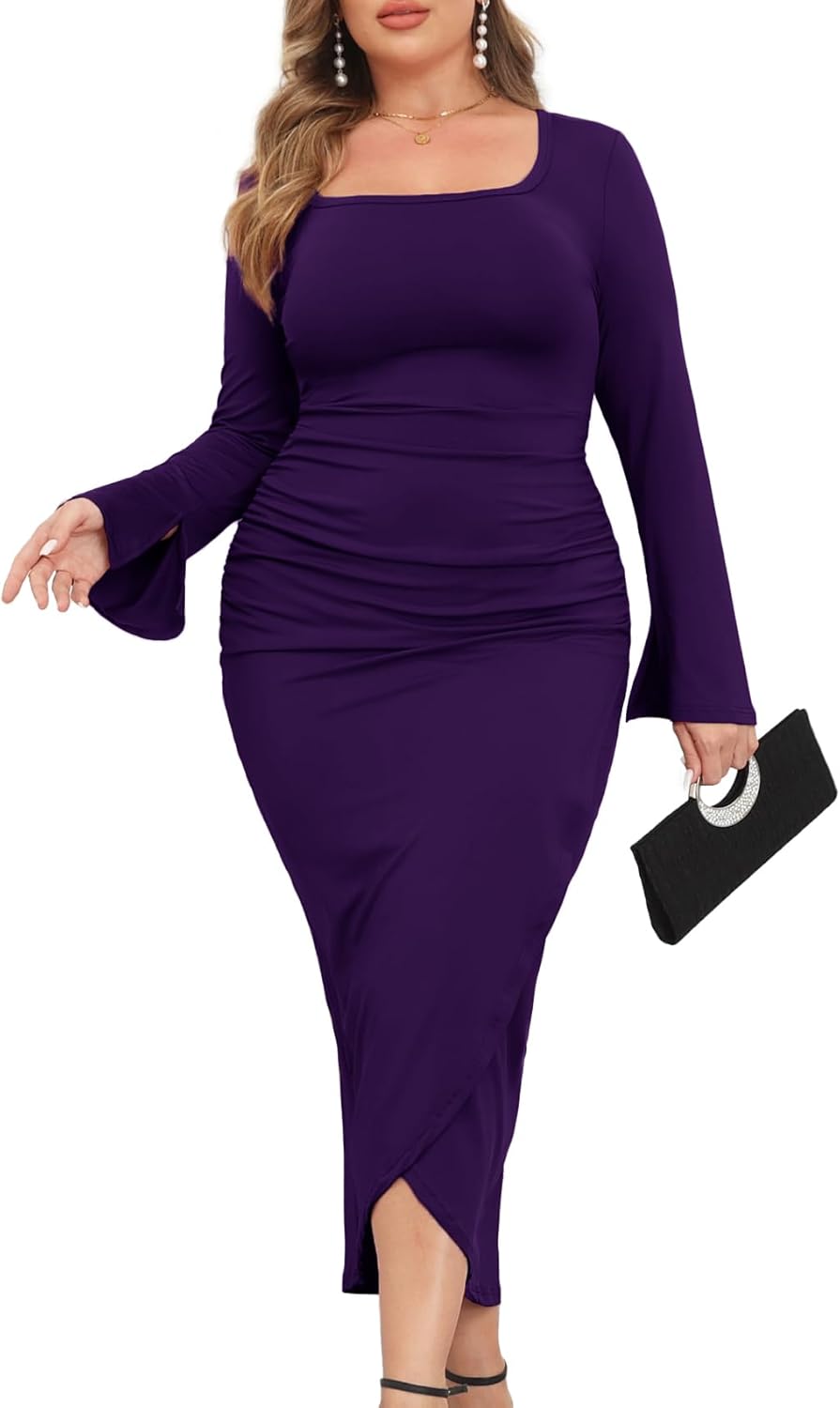 ZOMVA 2024 Plus Size Cocktail Dress Comfortable Bell Sleeves Wedding Guest Square Neck Semi Formal