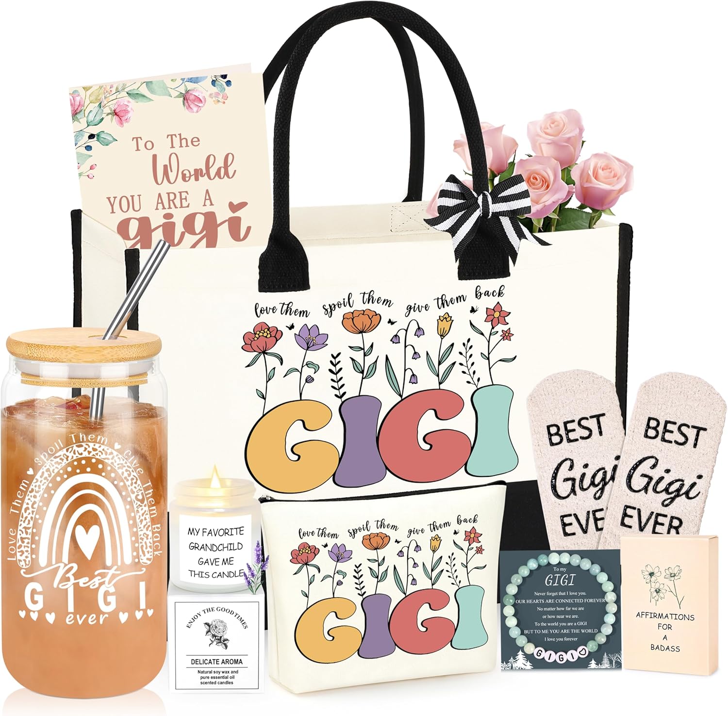- 【Christmas Gifts for Gigi】The Christmas Gigi Gift Set features a thoughtfully curated collection: a tote bag, makeup pouch, natural stone bracelet, scented candle, gigi-themed greeting card, 16-ounce glass coffee mug, 50 affirmation cards, a pair of warm socks, and an elegant gift box—all offering exceptional value. Now is the perfect time to show your gigi how much you care with a thoughtful gift. These presents are sure to bring a smile to her face and let her know how deeply you cherish her